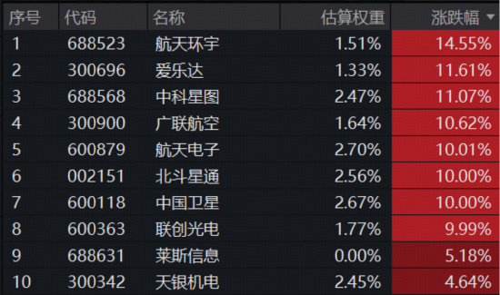 成份股方面,50只成份股中九成飘红,航天环宇涨超14%,爱乐达、中科星图、广联航空涨超10%,航天电子、北斗星通、中国卫星、联创光电纷纷涨停。